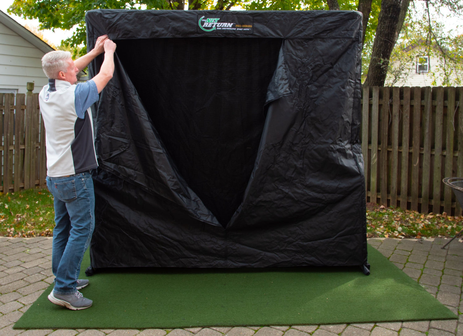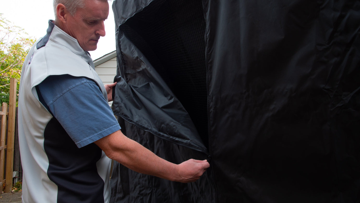 Die Abdeckung lässt sich in wenigen Minuten anbringen. Mit drei großen Reißverschlüssen, einer hinteren Spannschnur und Wasserablauflöchern an der Unterseite können Sie die Abdeckung problemlos befestigen und sicherstellen, dass das Netz auch bei schlechtem Wetter gut geschützt ist.