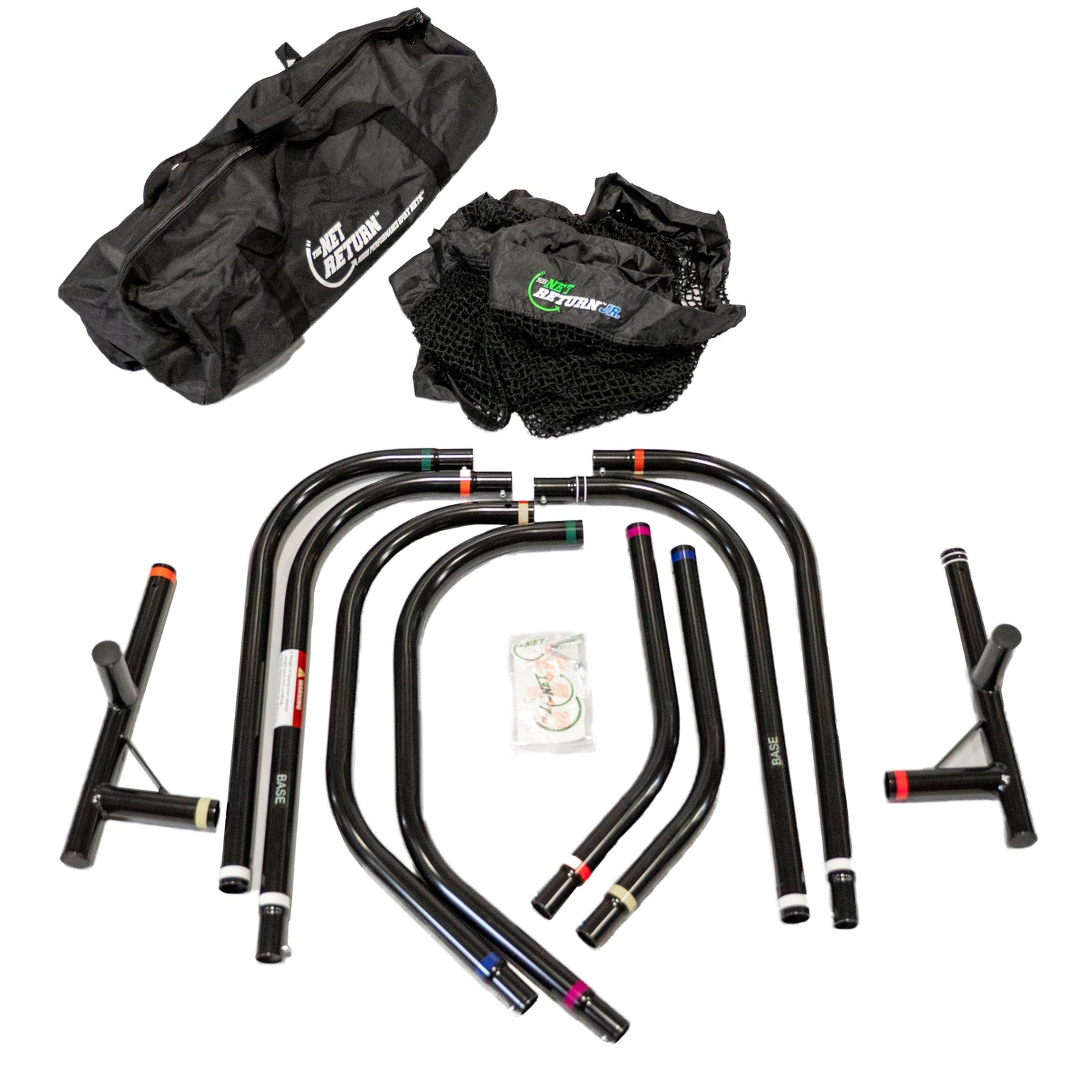 The Net Return Jr. is designed for years of use. It features a durable polyester net, a 1-inch powder-coated steel tubing frame, stainless steel snap fasteners, and a heavy-duty sandbag (sand not included).